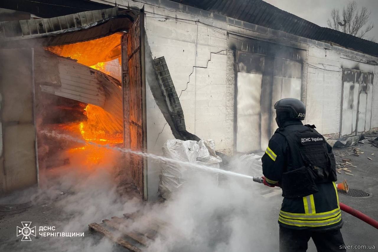 Пізно ввечері в Сновську щонайменше 4 ударні дрони атакували продовольчий бізнес. Загорівся склад й адмінбудівля. Пожежу загасили.